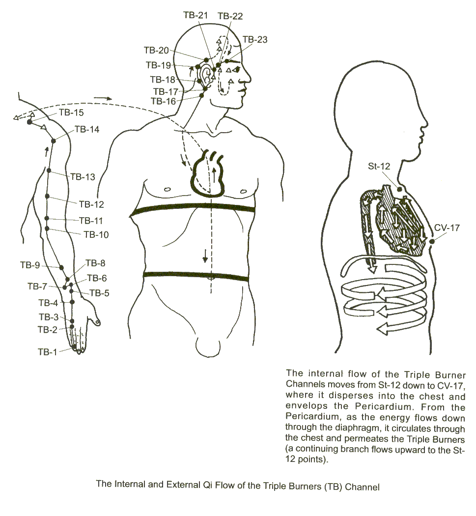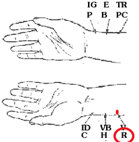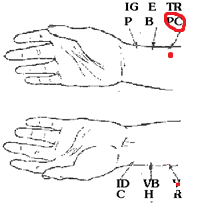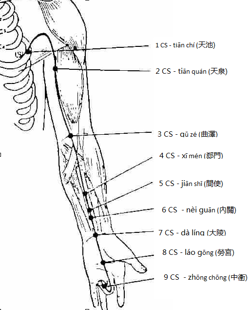 Con la regla anterior podemos deducir rápidamente que este meridiano circula desde el pecho hasta la mano.